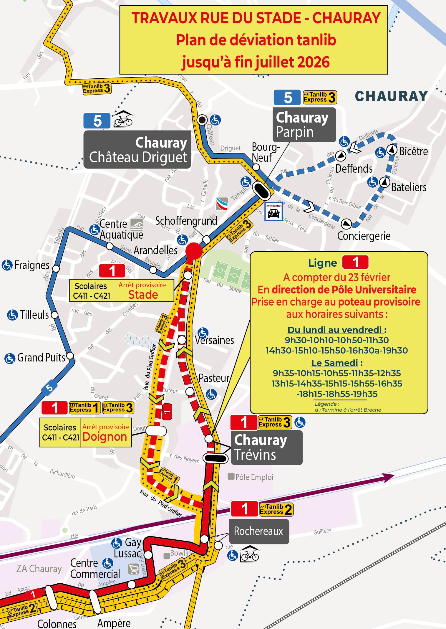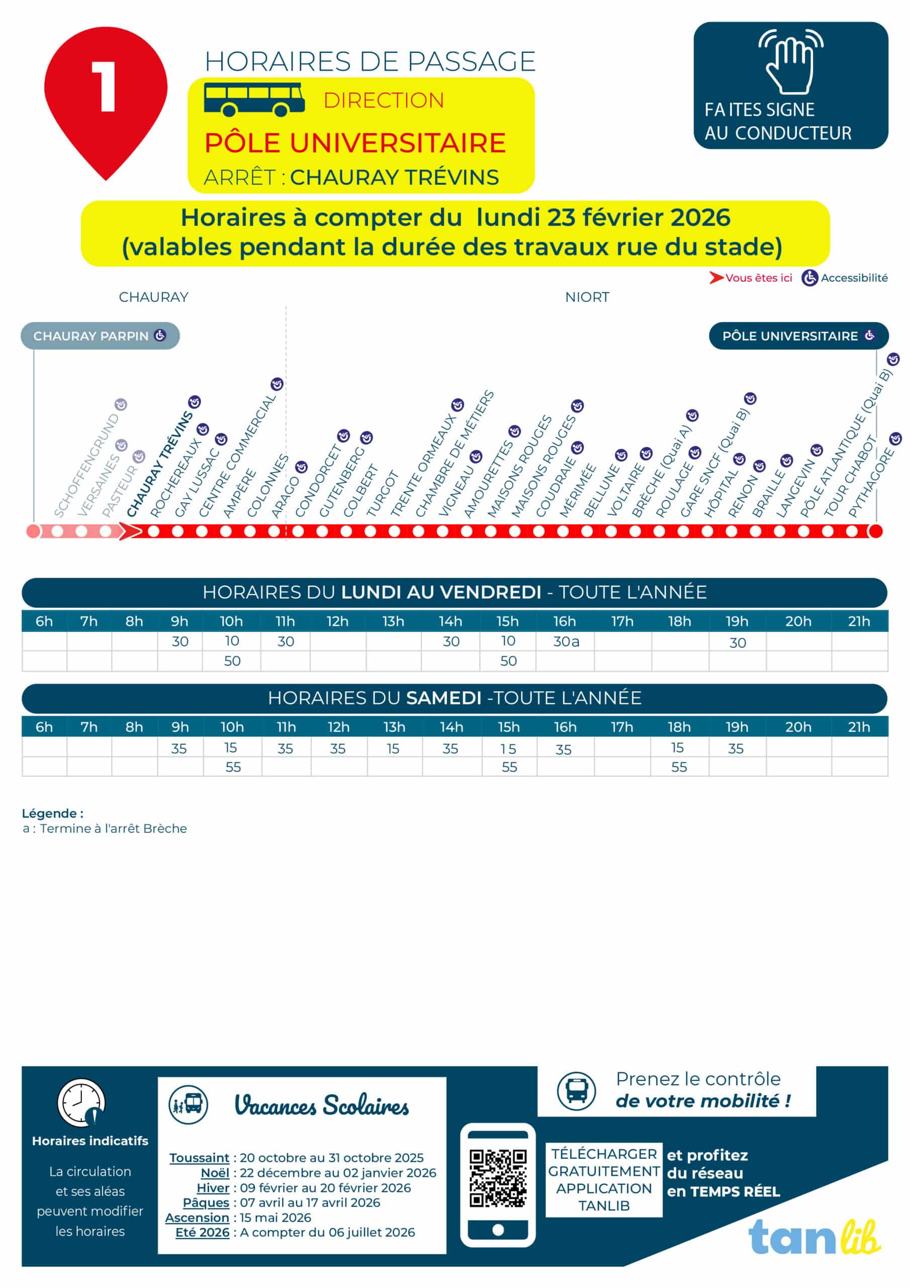 Suite aux travaux rue du stade, un nouvel arrêt provisoire "Chauray Trévins", situé rue du Stade (devant la MSA), sera ouvert à compter du lundi 23 février, uniquement à certains horaires (voir fiche horaire ci-dessous). Pour les autres horaires, rendez-vous à l'arrêt provisoire "Doignon" situé rue du Pied Griffier à l'intersection de la rue Doignon à Chauray.