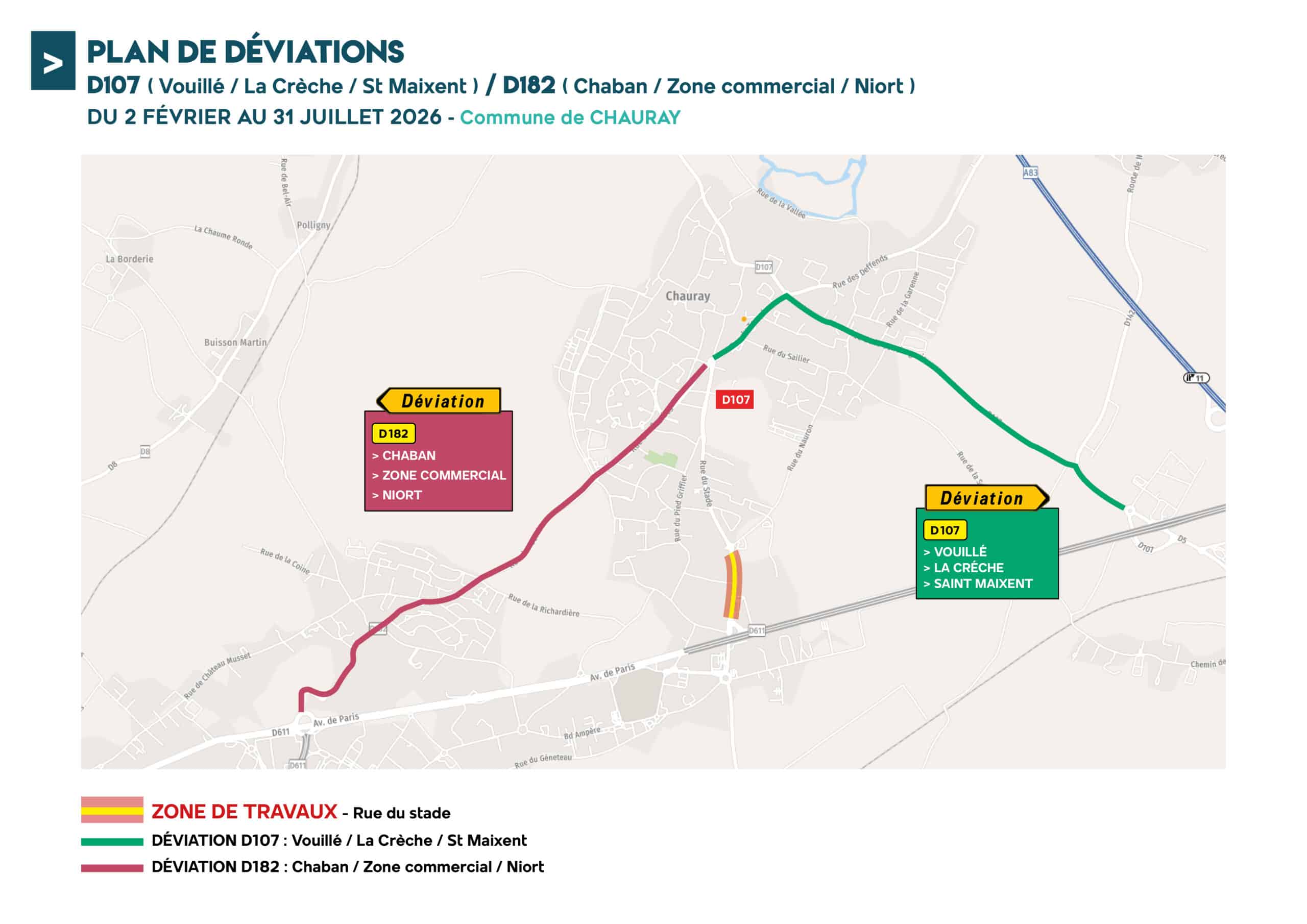 - Pour accéder à la zone commerciale, il est recommandé d’emprunter la départementale D107 (déviation La Crèche / Saint-Maixent) ou la D182 en direction de Chaban.