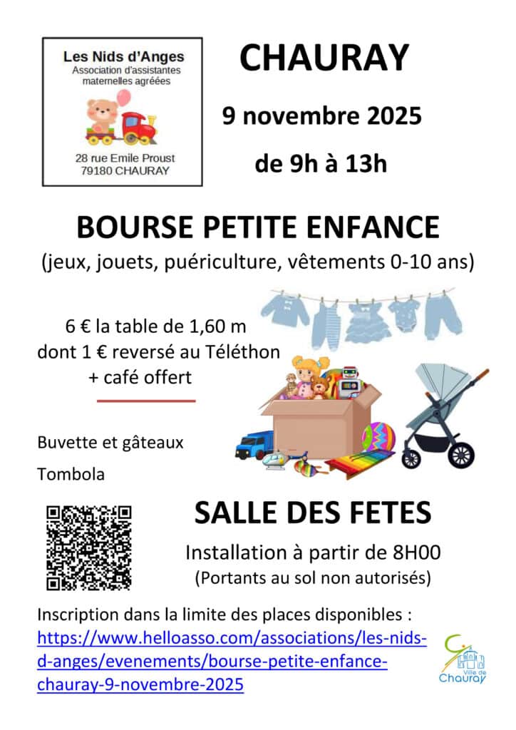 L'association des assistantes maternelles agréées de Chauray organise sa 7ème Bourse Petite Enfance le dimanche Dimanche 9 novembre 2025 de 9h à 13h, à la salle des fêtes de Chauray. Vente de jeux, jouets, matériel de puériculture et vêtements 0-10 ans.